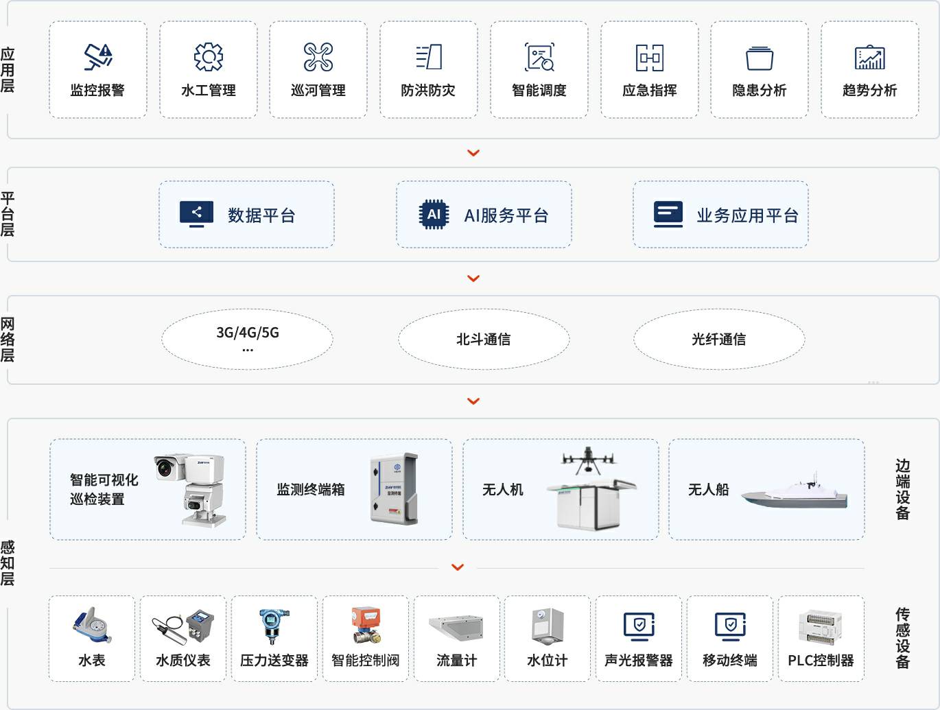 自研感知设备体系与软件平台体系,打破数据孤岛,软硬件系统高效交互,系统部署迅速且易维护。打造智慧防汛管理解决方案、智慧水库综合管理解决方案、城市内涝预警与排水信息化解决方案等众多解决方案,实现“一张网、一基础、N应用”的智慧水利信息化平台。